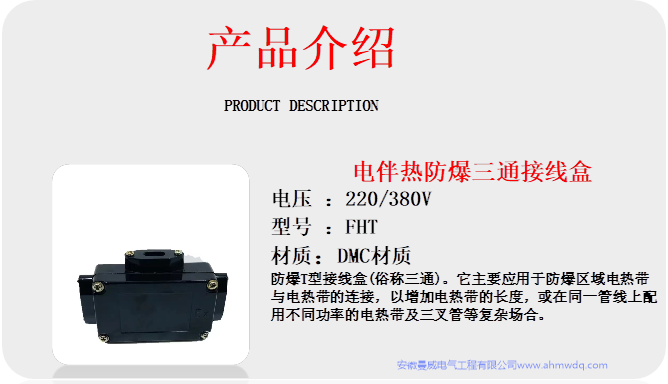 防爆三通接線盒(俗稱T型接線盒)。它主要應用于防爆區域電熱帶與電熱帶的連接,以增加電熱帶的長度,或在同一管線上配用不同功率的電熱帶及三叉管等復雜場合,其外殼為DMC塑料制成。